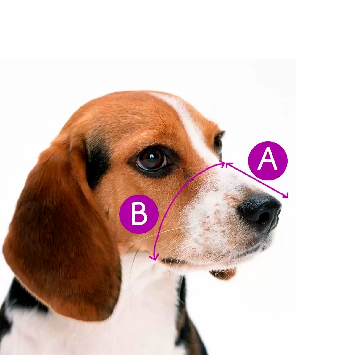 Medida B: Mide el contorno del hocico en la parte más ancha y súmale 5 a 7 centímetros, esta será la medida B