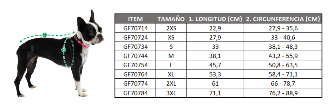 Talla L: Largo espalda 45.7 cm, circunferencia pecho 50.8 - 63.5 cm