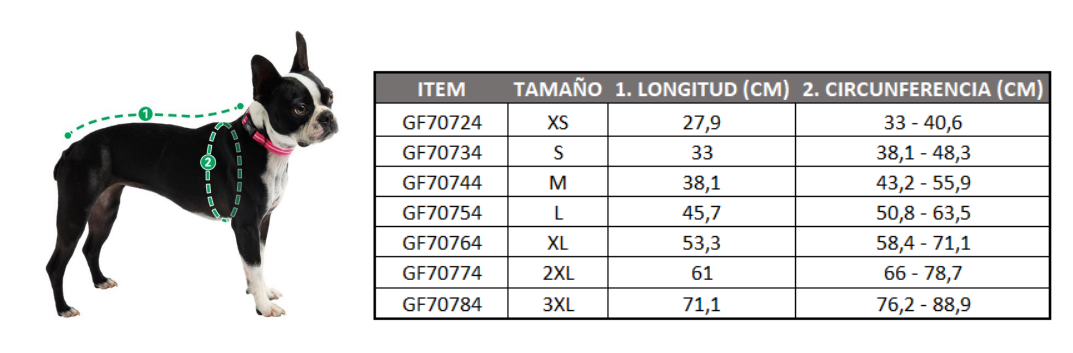 Talla L: Largo espalda 45.7 cm, circunferencia pecho 50.8 - 63.5 cm